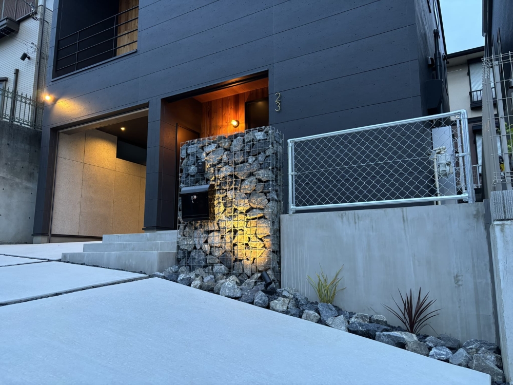 大胆なガビオンを採用した外構。武骨でありながら洗練された世界観を演出します。
